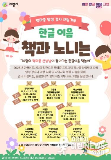이런뉴스(e-runnews) 김삼성 기자 | 의왕시는 '한글 이음 사업'의 일환으로 민관학이 협력하는 ‘찾아가는 도서관 책마중 프로그램’을 활발히 추진하고 있다고 밝혔다.