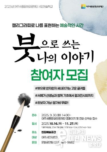 이런뉴스(e-runnews) 김삼성 기자 | 여주세종문화관광재단은 오는 10월 16일부터 두달간 여주시민을 위한 문화예술교육 프로그램인 시민예술학교 '붓으로 쓰는 나의 이야기'를 진행한다.
