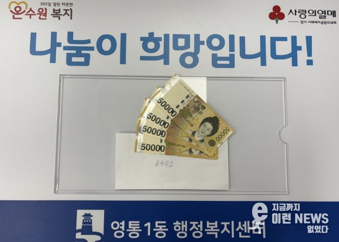 이런뉴스(e-runnews) 김삼성 기자 | 수원특례시 영통구 영통1동 행정복지센터는 사례관리대상자로 지원을 받아왔던 한 주민이 다른 동의 임대주택으로 이주하게 되어 그동안의 지원에 대한 감사의 뜻으로 20만 원을 기부했다고 밝혔다.