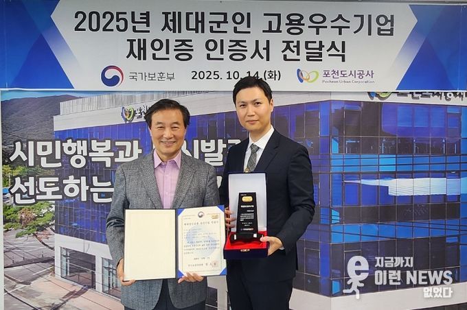 이런뉴스(e-runnews) 김삼성 기자 | 경기북부보훈지청 제대군인지원센터는 지난 14일 오후 3시, 포천도시공사에서 ‘2025년 제대군인 주간 제대군인 고용우수기업 인증서 및 인증패 전달식’을 개최했다.