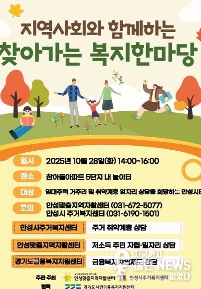 이런뉴스(e-runnews) 김삼성 기자 | 안성시는 오는 10월 28일 오후 2시부터 4시까지 참아름아파트 5단지 내에서 ‘지역사회와 함께하는 찾아가는 복지 한마당’을 열고, 시민들을 대상으로 찾아가는 주거복지 이동상담소를 운영한다.