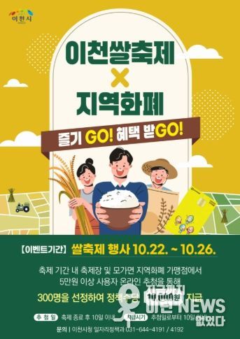 이런뉴스(e-runnews) 김삼성 기자 | 이천시는 2025 이천쌀문화축제 기간에 지역화폐 이용을 촉진하고 지역경제를 활성화하기 위해 코나아이(주)의 경기지역화폐 사회공헌 재원을 활용하여 ‘이천쌀축제, 지역화폐로 즐기고(GO), 혜택받고(GO)’ 이벤트를 추진한다고 밝혔다.