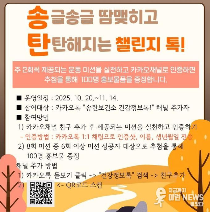이런뉴스(e-runnews) 김삼성 기자 | 평택시 송탄보건소는 10월 20일부터 11월 14일까지 카카오톡을 활용한 ‘(송)글송글 땀 맺히고 (탄)탄해지는 챌린지 톡!’을 운영할 예정이라고 밝혔다.