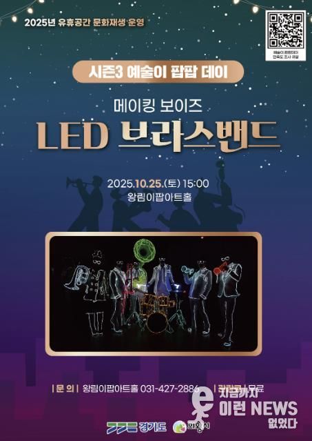 이런뉴스(e-runnews) 김삼성 기자 | 의왕시는 오는 10월 25일 오후 3시, 왕림이팝아트홀(의왕시 왕곡로 74)에서 금관악기 앙상블과 첨단 엘이디(LED) 조명 기술을 결합한 융복합 공연‘엘이디(LED) 브라스밴드’를 선보인다고 밝혔다.