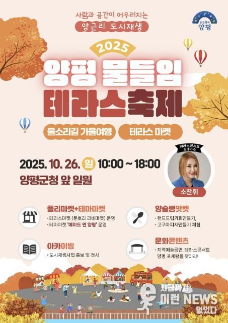 이런뉴스(e-runnews) 김삼성 기자 | 양평군은 오는 10월 26일, 양평군청 앞 특설무대 및 주차장 일원에서 ‘2025 양평 물들임 테라스 축제’를 개최한다고 밝혔다.