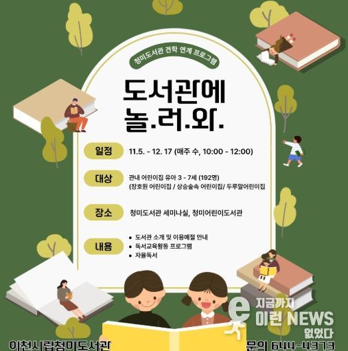 이런뉴스(e-runnews) 김삼성 기자 | 이천시 청미도서관은 오는 11월 5일부터 12월 17일까지 관내 어린이집 유아를 대상으로 도서관 견학 연계 프로그램 ‘도서관에 놀.러.와. 시즌2’를 운영한다.