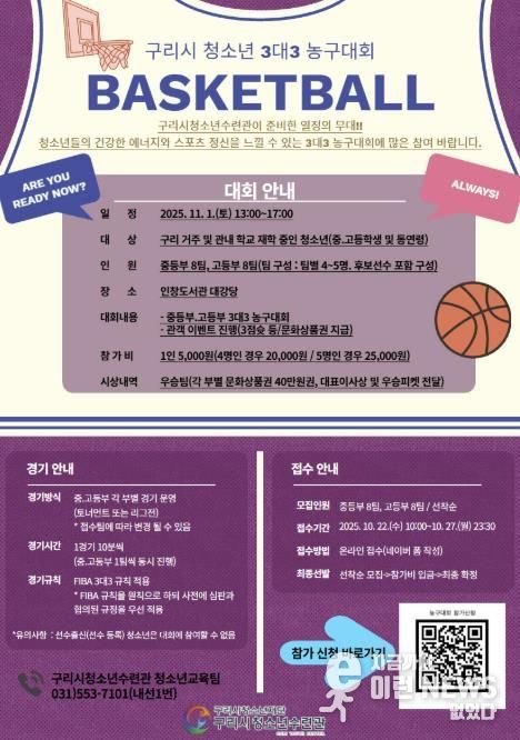 이런뉴스(e-runnews) 김삼성 기자 | 구리시청소년재단 청소년수련관은 '2025 구리시 청소년 3대3 농구대회' 참가 신청을 10월 22일부터 10월 27일까지 온라인으로 신청받는다고 밝혔다.