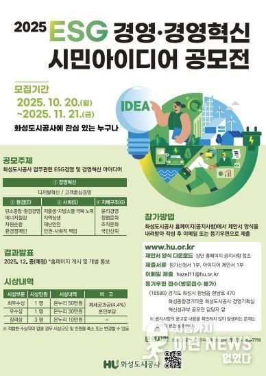 이런뉴스(e-runnews) 김삼성 기자 | 화성도시공사는 오는 10월 20일부터 11월 21일까지 ‘2025년 ESG경영·경영혁신 시민 아이디어 공모전’을 개최한다고 밝혔다.