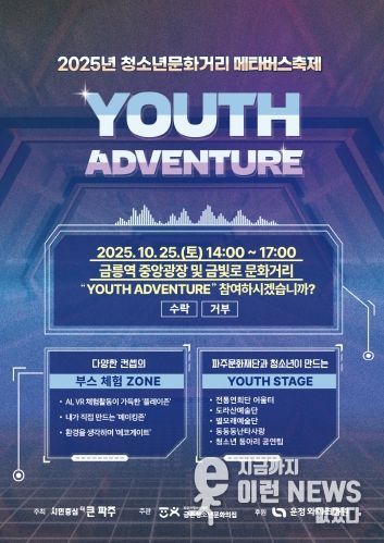 이런뉴스(e-runnews) 김삼성 기자 | (재)파주시청소년재단 금촌청소년문화의집은 오는 2025년 10월 25일 토요일 금릉역 중앙광 및 금빛로 문화거리 일대에서 2025년 청소년문화거리메타버스축제 ‘YOUTH ADVENTURE’를 개최한다고 밝혔다.