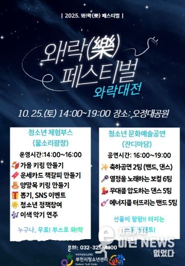 이런뉴스(e-runnews) 김삼성 기자 | 부천여성청소년재단이 운영하는 부천시청소년센터는 오는 10월 25일 오후 2시, 부천 오정대공원에서 와!락(樂) 페스티벌 ‘와락대전’을 진행한다고 밝혔다.