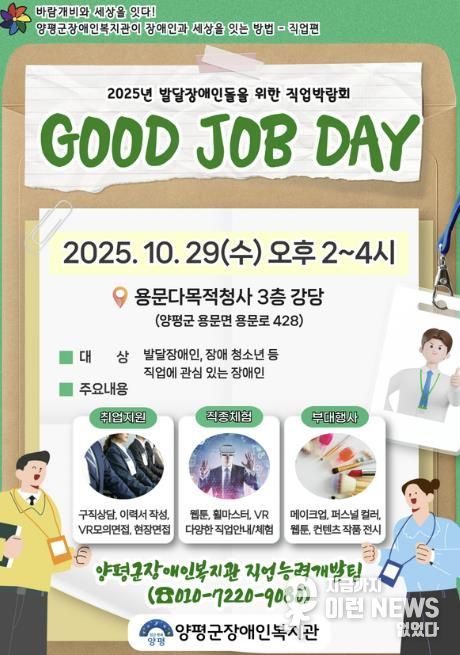 이런뉴스(e-runnews) 김삼성 기자 | 대한불교조계종사회복지재단이 운영하는 양평군장애인복지관은 오는 29일 오후 2시부터 4시까지 용문다목적청사 3층 강당에서 발달장애인의 직업 탐색 기회를 지원하기 위한 직업박람회 ‘GOOD JOB DAY’를 개최한다.