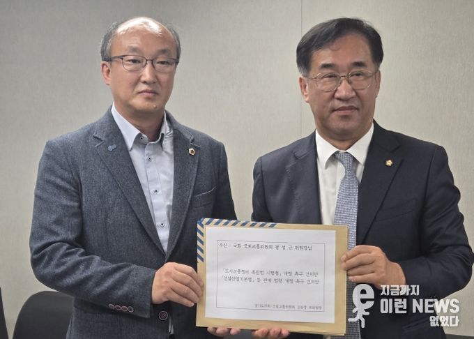 이런뉴스(e-runnews) 김삼성 기자 | 경기도의회 건설교통위원회 김동영 부위원장(더불어민주당, 남양주 오남)은 20일 경기도청 율곡홀에서 열린 2025년 국회 국토교통위원회 국정감사 현장을 찾아, 국회 국토교통위원회 맹성규 위원장에게 '도시교통정비 촉진법 시행령' 개정 촉구 건의안과 '건설산업기본법' 개정 촉구 건의안 등 경기도의회가 의결한 두 건의 건의안을 전달했다.