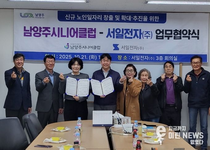 이런뉴스(e-runnews) 김삼성 기자 | 남양주시는 21일 노인 일자리 전담기관 남양주시니어클럽이 진건읍 진관산업단지 내 서일전자(주)와 노인 일자리 공동체사업단 운영을 위한 업무협약을 체결했다고 밝혔다.