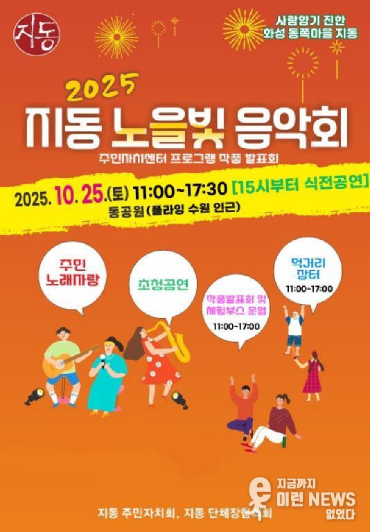 이런뉴스(e-runnews) 김삼성 기자 | 오는 10월 25일, 수원시 팔달구 지동 동공원(지동 267-12)에서 활력 넘치는 가을날을 아름다운 음악과 주민들의 열정으로 채울 특별한 축제, ‘2025 지동 노을빛 음악회·주민자치센터 작품발표회’가 열린다.
