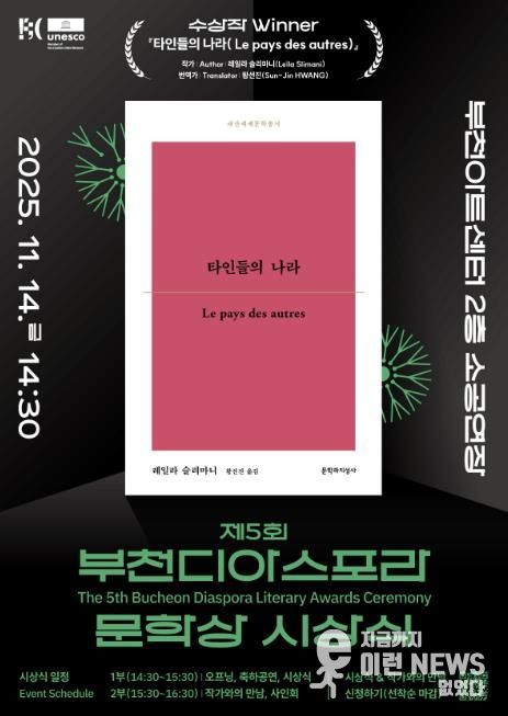 이런뉴스(e-runnews) 김삼성 기자 | 부천시는 11월 14일 부천아트센터에서 열리는 ‘2025년 제5회 부천디아스포라문학상’ 시상식을 앞두고, 수상작으로 레일라 슬리마니 작가의 ‘타인들의 나라(Le pays des autres)’를 선정했다고 22일 밝혔다.