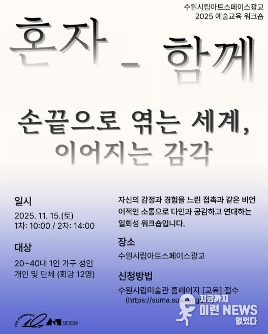 이런뉴스(e-runnews) 김삼성 기자 | 경기도 수원시립미술관은 예술을 통해 타인과의 관계를 확장하고 감각을 회복하는 예술교육 워크숍 '혼자-함께'를 11월 15일 수원시립아트스페이스광교에서 개최한다.