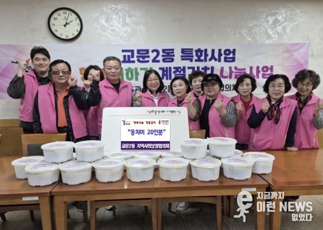 한편, ‘행복 더하기 계절 김치 나눔 사업’은 2023년부터 매년 이어지고 있는 교문2동 지역사회 보장협의체의 대표 복지 특화사업으로, 계절별로 맞춤형 김치를 담가 관내 취약계층에 전달해 큰 호응을 얻고 있다. 협의체는 올겨울에도‘겨울 계절 김치 나눔’을 추진해 지역 내 소외된 이웃들에게 따뜻한 마음을 전할 예정이다.