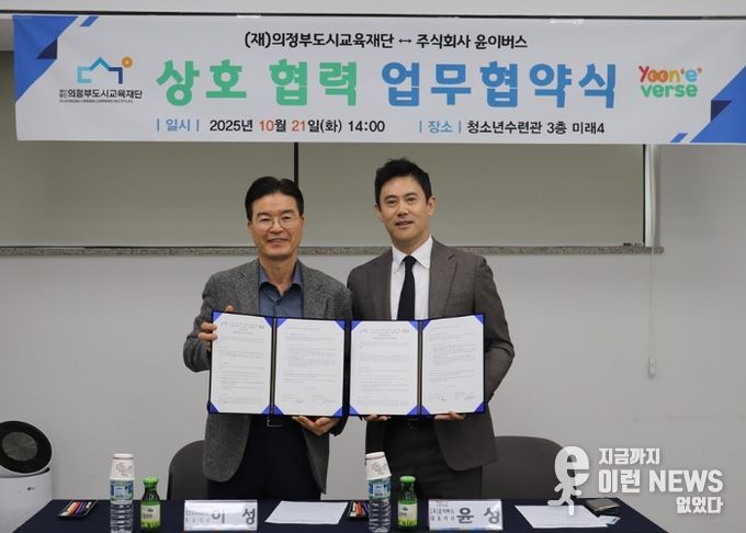 이런뉴스(e-runnews) 김삼성 기자 | (재)의정부도시교육재단은 지난 10월 21일 ㈜윤이버스와 ‘AI 기반 영어학습 협력 기반 구축을 위한 업무협약’을 체결했다.