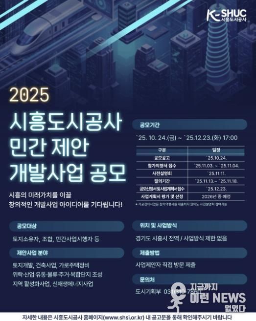 이런뉴스(e-runnews) 김삼성 기자 | 시흥도시공사는 민간의 창의적인 개발 아이디어와 공사의 개발사업 역량을 결합하여, 신규 개발사업을 발굴하기 위한 ‘민간 제안 개발사업 공모’를 추진한다고 24일 밝혔다.