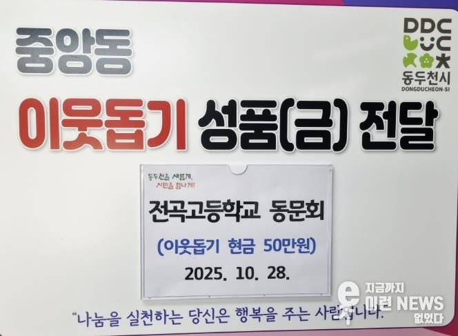 이런뉴스(e-runnews) 김삼성 기자 | 동두천시청 전곡고등학교 동문회는 지난 28일, 지역 내 어려운 이웃을 돕기 위해 성금 50만 원을 중앙동 행정복지센터에 기탁했다.