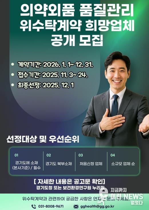 이런뉴스(e-runnews) 김삼성 기자 | 경기도보건환경연구원은 오는 24일까지 ‘2026년 의약외품 품질검사 위·수탁계약’ 참여를 희망하는 제조·수입업체를 모집한다.