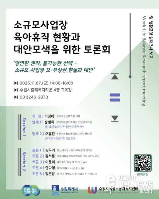 이런뉴스(e-runnews) 김삼성 기자 | 수원시여성노동자복지센터가 11월 7일 오후 2시 수원시홍재복지타운 4층 교육장에서 열리는 ‘소규모 사업장 육아휴직 현황과 대안 모색을 위한 토론회’ 참가자를 모집한다.