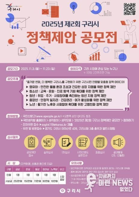 이런뉴스(e-runnews) 김삼성 기자 | 구리시는 오는 11월 3일부터 11월 23일까지'2025년 제2회 구리시 정책 제안 공모전'을 개최한다고 밝혔다. 이번 공모전의 주제는 ‘구리 시민(영유아·청소년·청년·중장년·노년) 나이별 맞춤형 정책 아이디어’다.