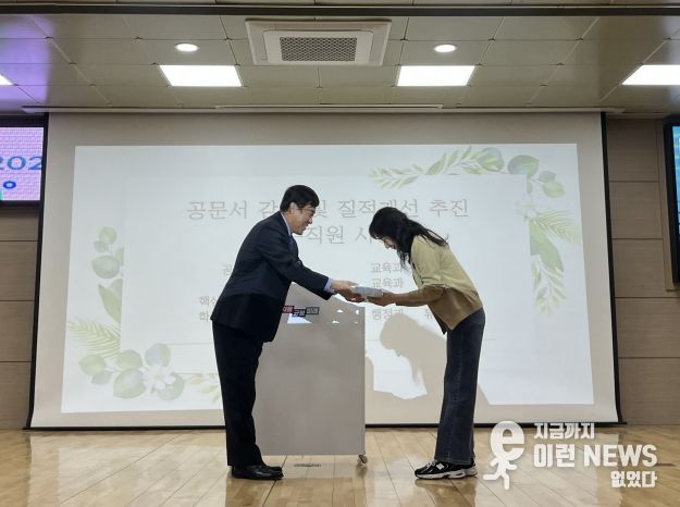 이런뉴스(e-runnews) 김삼성 기자 | 경기도의정부교육지원청은 2025년 11월 3일 공문서 감축 및 질적 개선 추진 캠페인을 진행하고, 이에 기여한 우수직원을 선정하여 시상했다고 밝혔다.