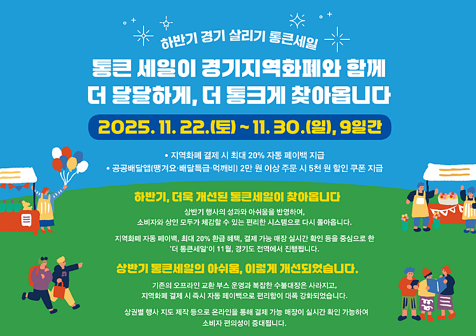 2025년 상반기 통큰 세일은 지난 6월 21일부터 29일까지 9일간 도내 396개 상권이 참여한 대규모 소비 촉진 행사로 소비 인증 페이백, 경기도 공공배달애플리케이션 할인, 상인회 자율 행사 등 다양한 프로그램이 함께 운영됐다.