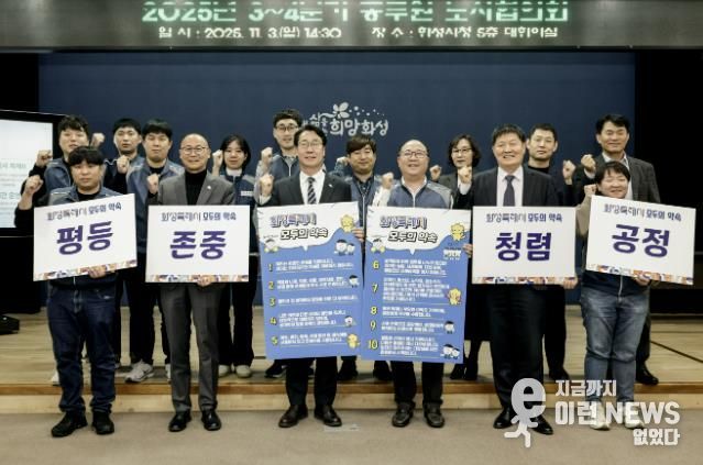 또한, ‘화성특례시 모두의 약속’ 퍼포먼스를 통해 청렴과 공정, 평등의 가치를 함께 되새기며 건강한 조직문화 정착을 위한 노사 간 의지를 다졌다.