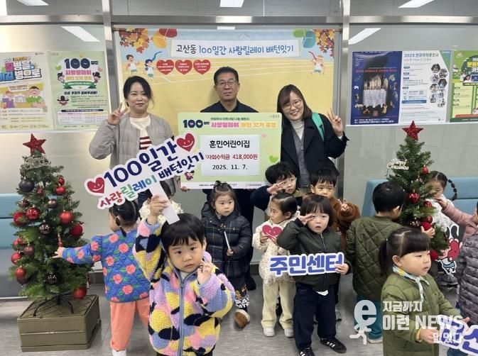 이런뉴스(e-runnews) 김삼성 기자 | 의정부시 고산동주민센터는 11월 7일 훈민어린이집이 바자회를 통해 모은 수익금 40여만 원을 기탁하며 ‘100일간 사랑릴레이 배턴 잇기’에 동참했다고 밝혔다.