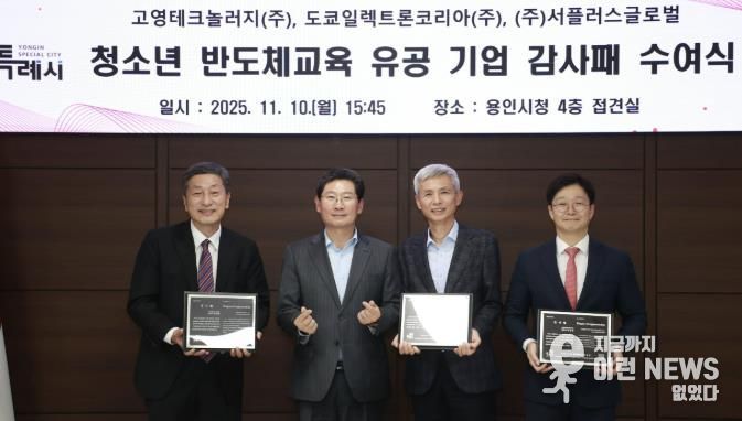 이런뉴스(e-runnews) 김삼성 기자 | 용인특례시는 10일 시청 접견실에서 ㈜서플러스글로벌과 업무협약(MOU)을 체결하고, 지역 청소년 반도체 교육에 기여한 기업 3곳에 감사패를 수여했다고 11일 밝혔다.