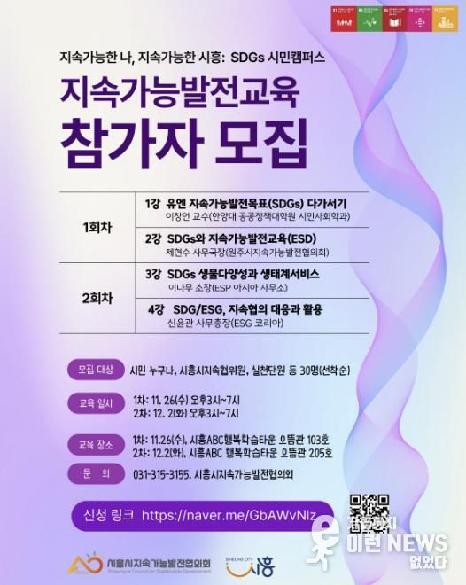 이런뉴스(e-runnews) 김삼성 기자 | 시흥시지속가능발전협의회는 오는 11월 26일과 12월 2일 시흥ABC행복학습타운에서 양일간 ‘지속가능한 나, 지속가능한 시흥 SDGs 시민캠퍼스’를 개최한다.