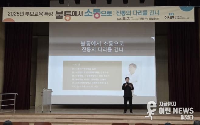 이런뉴스(e-runnews) 김삼성 기자 | 안산시는 단원구청 단원홀에서 ‘불통에서 소통으로: 진통의 다리를 건너’를 주제로 부모교육 특강을 진행했다고 11일 밝혔다.