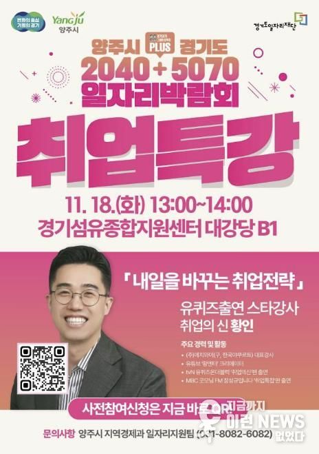 이런뉴스(e-runnews) 김삼성 기자 | 양주시가 오는 18일 경기섬유종합지원센터에서 열리는 '2025 양주시·경기도 2040+5070 통합 일자리박람회'에서 취업 전문가 황인 강사의 특별 강연을 진행한다.