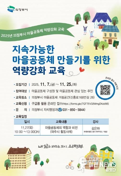 이런뉴스(e-runnews) 김삼성 기자 | 의정부시는 11월 27일 의정부시 마을공동체 거점공간(신흥로168번길 26)에서 ‘마을공동체 역량 강화 교육’을 운영한다.