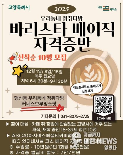 이런뉴스(e-runnews) 김삼성 기자 | 고양특례시가 고양시에 거주하거나 활동(재학, 재직)하는 청년들을 대상으로 카페 취·창업에 적용할 수 있는 ‘바리스타 베이직 자격증반’을 운영한다.