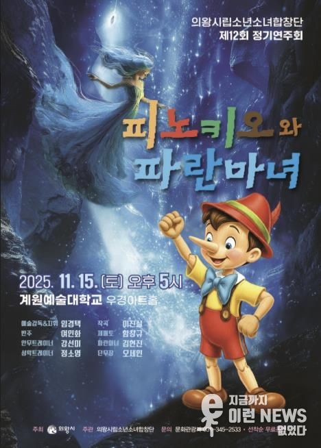 이런뉴스(e-runnews) 김삼성 기자 | 의왕시가 주최하고 의왕시립소년소녀합창단이 주관하는 제12회 정기연주회 '피노키오와 파란마녀'가 11월 15일(토), 오후 5시 우경아트홀에서 개최된다.