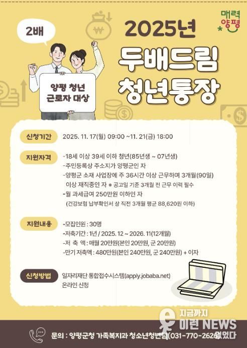 이런뉴스(e-runnews) 김삼성 기자 | 양평군은 청년들의 자립과 미래 설계 기반 마련을 위해 ‘두배드림 청년통장’ 사업을 추진한다고 밝혔다.