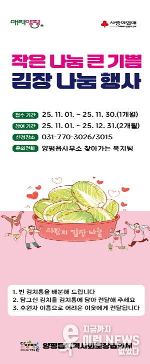 한편, 김장 나눔 참여를 희망하는 주민은 11월 1일부터 30일까지 양평읍 찾아가는 복지팀(☎ 031-770-3026, 3015)에 기부 신청할 수 있으며, 신청자에게는 김치통이 제공된다. 기부된 김치는 복지 대상자 중 꼭 필요한 가구를 선정해 전달될 예정이다.
