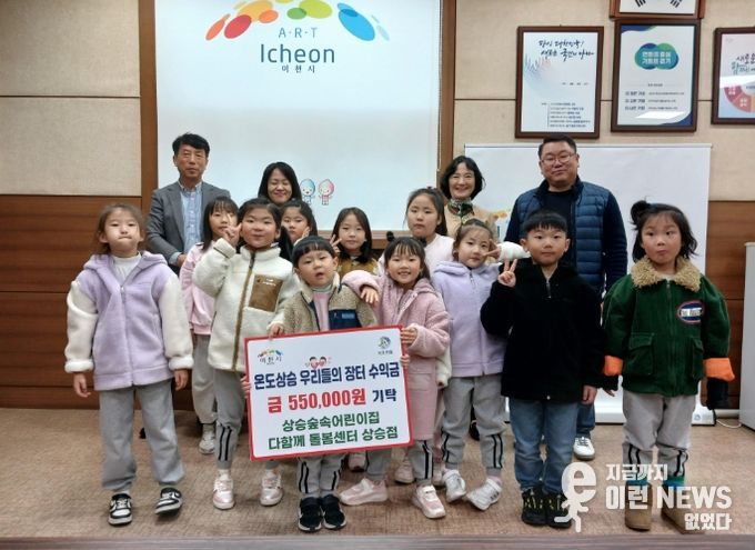 이런뉴스(e-runnews) 김삼성 기자 | 이천시 장호원읍은 상승숲속어린이집과 다함께 돌봄센터 상승점이 11월 12일, 장호원읍행정복지센터에 어린이들과 함께 방문하여 ‘온도상승 우리들의 장터’ 수익금 55만 원을 전달했다고 밝혔다.
