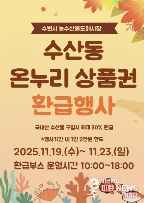 수원시 관계자는 “국내 수산물 소비를 활성화하고, 소비자가 저렴한 가격에 수산물을 구매할 수 있도록 온누리상품권 환급행사를 연다”며 “많은 분이 수원시농수산물도매시장을 찾아주시길 바란다”고 말했다.