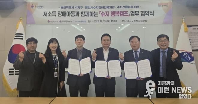 이런뉴스(e-runnews) 김삼성 기자 | 용인특례시 수지구는 13일 용인시수지장애인복지관과 수지신용협동조합과 함께 저소득 장애아동의 복지 향상과 장애 인식 개선을 위한 ‘수지 행복캠프’ 추진 업무협약을 체결했다고 14일 밝혔다.