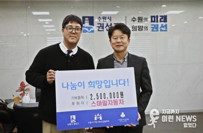 이런뉴스(e-runnews) 김삼성 기자 | 수원시 권선구는 지난 13일, 관내 스마일자동차(대표 우영진)에서 어려운 이웃을 돕기 위한 후원금 250만원을 기탁했다고 밝혔다.