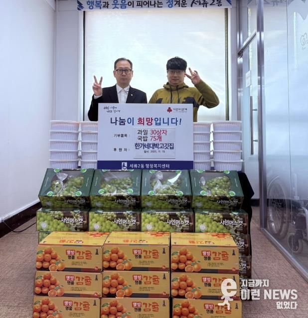 이런뉴스(e-runnews) 김삼성 기자 | 수원시 권선구 세류2동에 위치한 '한가네 대박고깃집'은 지난 13일, 국밥 75개와 귤 10상자, 샤인머스캣 20상자를 세류2동 행정복지센터에 기부했다.