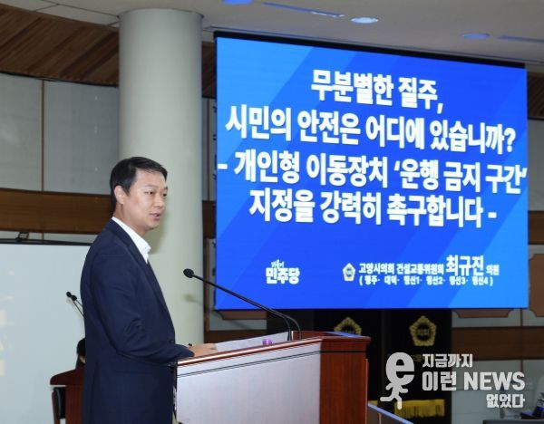 이런뉴스(e-runnews) 김삼성 기자 | 고양특례시의회 최규진 의원(행주·대덕·행신1 ‧ 2 ‧ 3 ‧ 4동)은 지난 13일 고양특례시의회 본회의장에서 개최된 제299회 제2차 정례회 제2차 본회의 시정질의에서 시민 안전을 위해 무분별하게 질주하는 개인형 이동장치 운행 금지 구간 지정을 강력히 촉구했다.