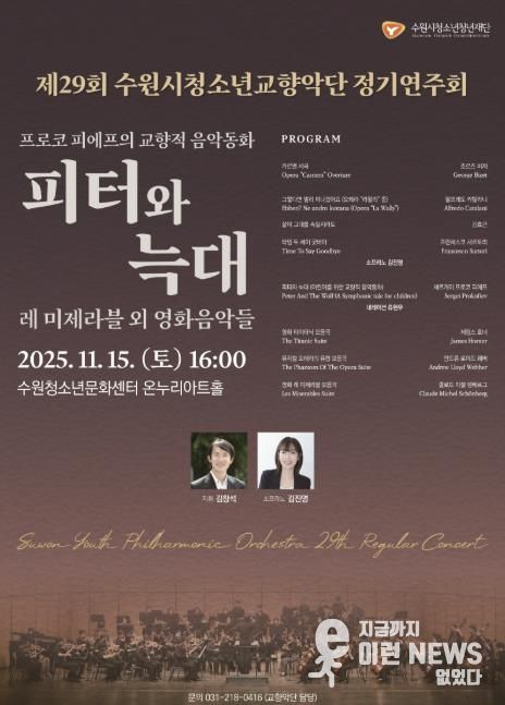 이런뉴스(e-runnews) 김삼성 기자 | 수원시청소년청년재단 수원청소년문화센터에서는 오는 11월 15일 오후4시, 온누리아트홀에서 제29회 정기연주회를 개최한다. 이번 연주회는 ‘프로코 피에프의 교향적 음악동화 '피터와 늑대'’를 중심으로, 세대를 아우르는 감동의 영화음악을 함께 선보이며 청소년 단원들의 풍성한 음악적 성장을 보여줄 예정이다.
