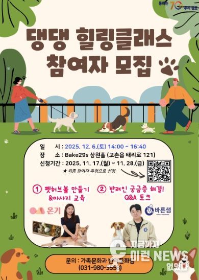 ‘댕댕 힐링클래스’는 반려견의 건강과 정서적 안정을 돕고, 보호자와의 긍정적인 교감을 형성하기 위해 마련된 참여형 교육프로그램으로 12월 6일(토) 고촌읍에 있는 ‘Bake29s’ 상원홀에서 진행된다. 모집 대상은 동물등록이 완료된 반려견을 키우는 김포시민 20명이다.