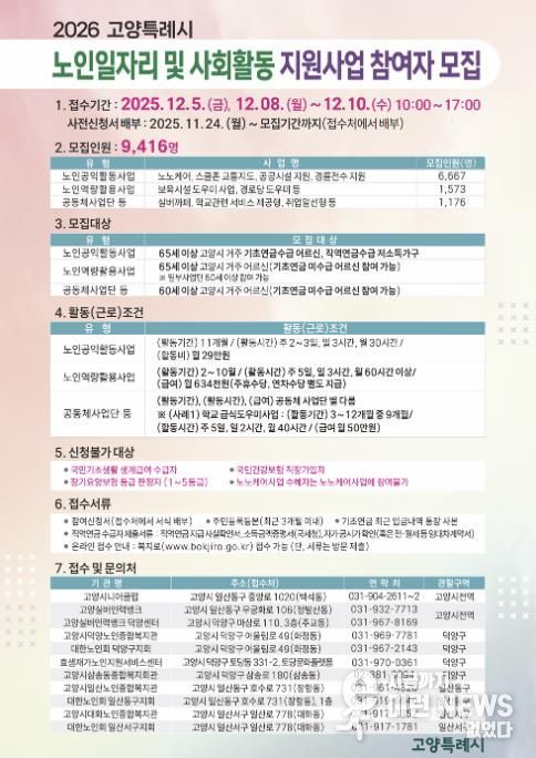 이런뉴스(e-runnews) 김삼성 기자 | 고양특례시는 2026년 노인일자리 및 사회활동지원 사업에 총 382억원을 투입해, 노인일자리 참여자 9,416명을 수행기관별 통합 모집한다고 밝혔다.