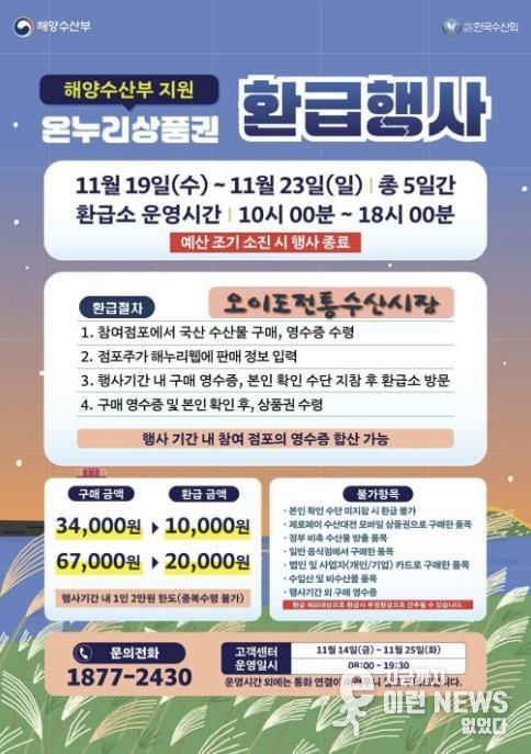 이런뉴스(e-runnews) 김삼성 기자 | 시흥시는 가을철을 맞아 수산물 체감물가 안정과 소비 활성화를 위해 오이도전통수산시장에서 ‘온누리상품권 환급 행사’를 11월 19일부터 23일까지 5일간 진행한다. 이번 행사는 전통시장 소비 촉진과 물가 안정 지원을 위해 마련됐다.